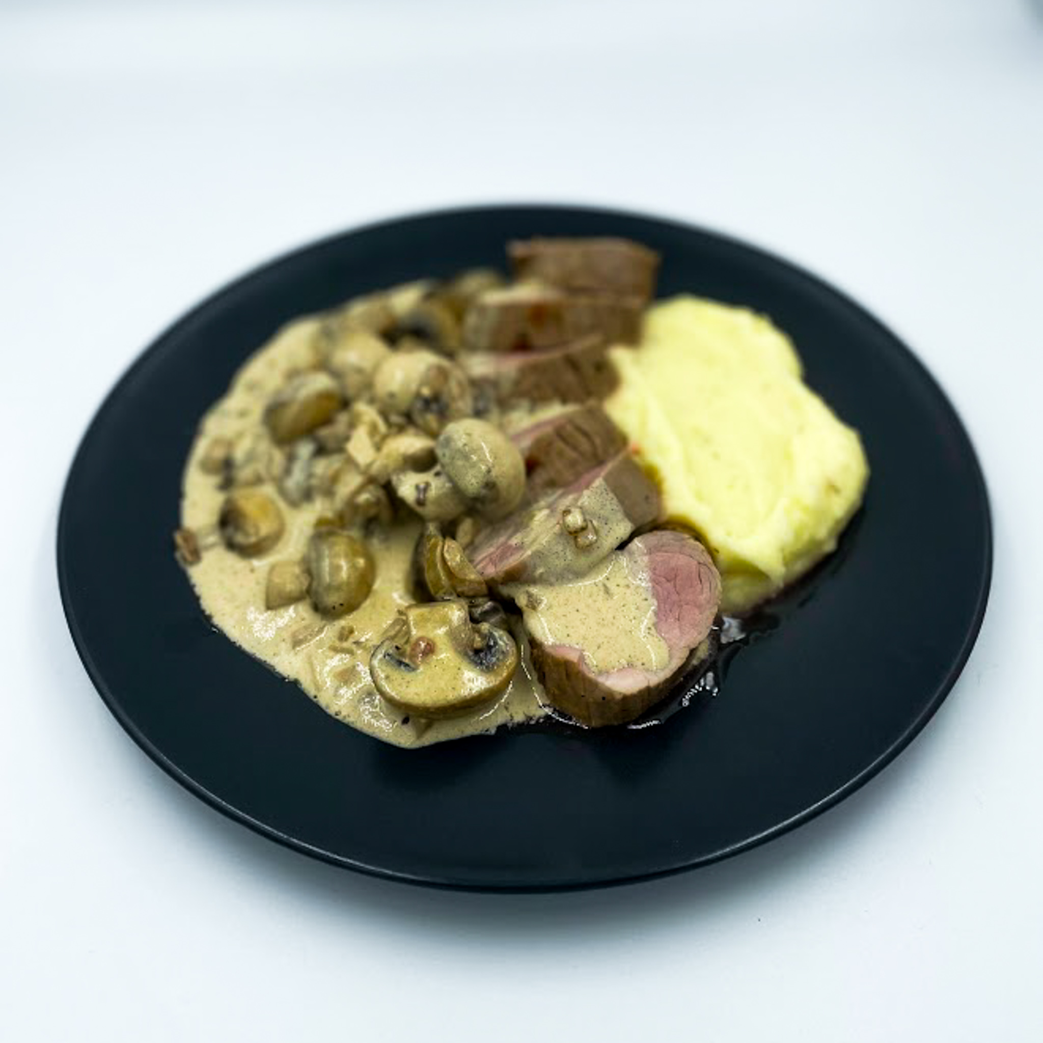 Vepřovou panenku osolíme, opepříme, přidáme rozmarýn, tymián, česnek, zalejeme olejem a necháme odležet. Namarinovanou vepřovou panenku orestujeme a vložíme na 15 minut do vyhřáté trouby. Maso podáváme nakrájené na plátky. Žampiony očistíme, osolíme a restujeme na oleji. Zalejeme smetanou a necháme povařit. Brambory oloupeme, osolíme, nakrájíme a uvaříme. Přidáme máslo a smetanu a rozšleháme.